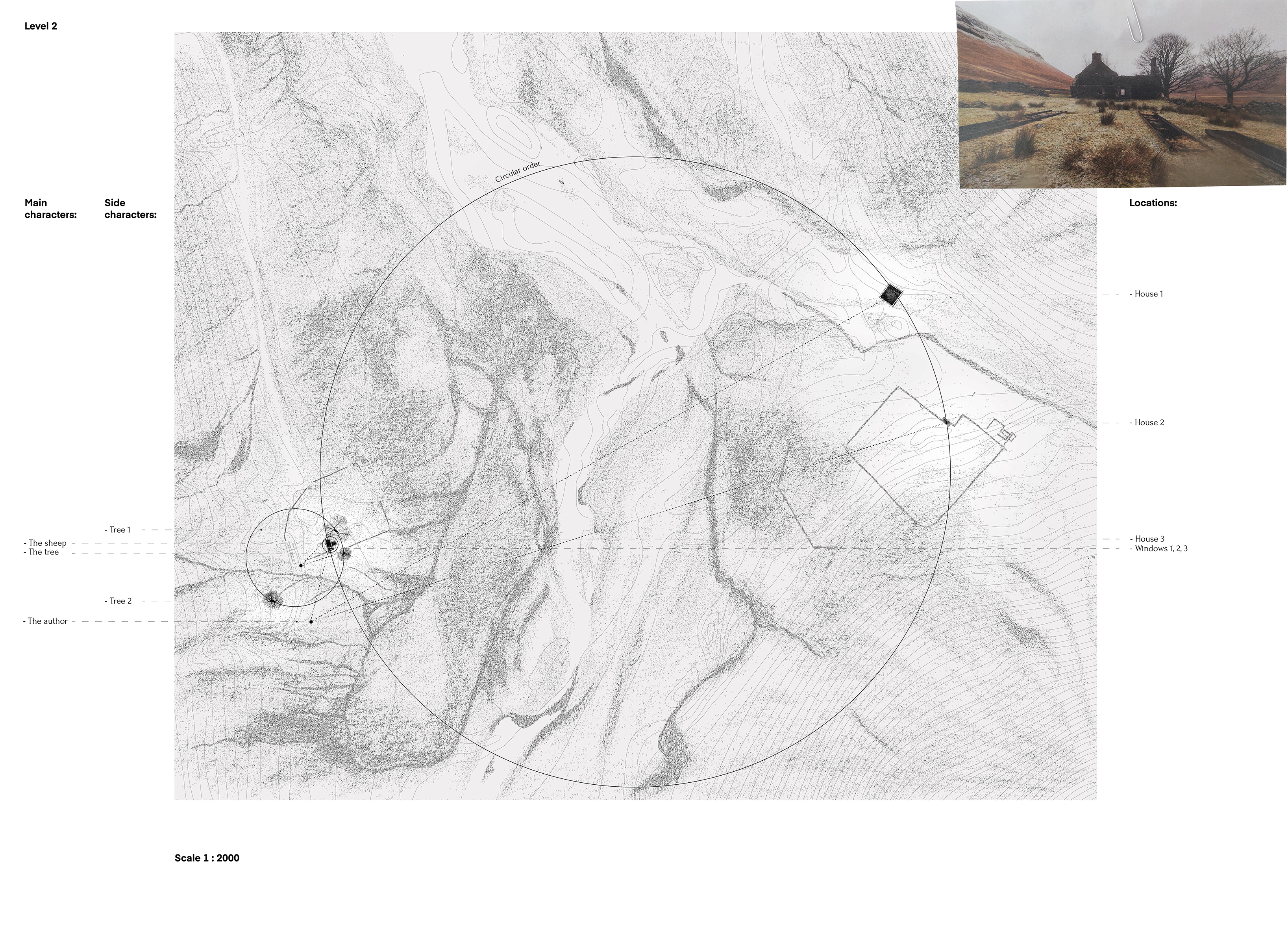 This site on the Isle of Mull exists within different levels of contraction or relaxation, done by a subject, to the landscape. The more our consciousness contracts the elements together, the less degree of detail is shown. The contraction, however, is not a sequence of repetitive actions, but rather a fusion of elements into a coherent whole. It is the action that we are conducting constantly, establishing connections and forming space.
